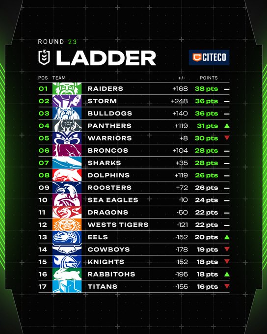 The Bulldogs, meanwhile, bounced back from a surprise loss at the Tigers in Round 22 to coast past the Warriors, 32-14. The win keeps them in 3rd, comfortably clear of 4th-placed Penrith and right on the tails of Melbourne and Canberra.