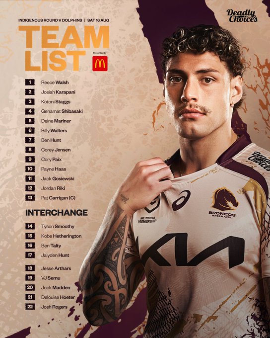 Broncos team: 1. Reece Walsh 2. Josiah Karapani 3. Kotoni Staggs 4. Gehamat Shibasaki 5. Deine Mariner 6. Billy Walters 7. Ben Hunt 8. Corey Jensen 9. Cory Paix 10. Payne Haas 11. Jack Gosiewski 12. Jordan Riki 13. Patrick Carrigan 14. Tyson Smoothy 15. Kobe Hetherington 16. Ben Talty 17. Jaiyden Hunt 18. Jesse Arthars 19. Va’a Semu 20. Jock Madden 21. Delouise Hoeter 22. Josh Rogers