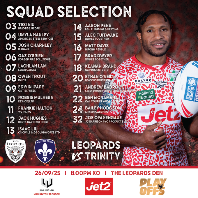 Leigh have made just one change to their squad from last weekend. Edwin Ipape is back from suspension to take the place of AJ Towse in the 21.